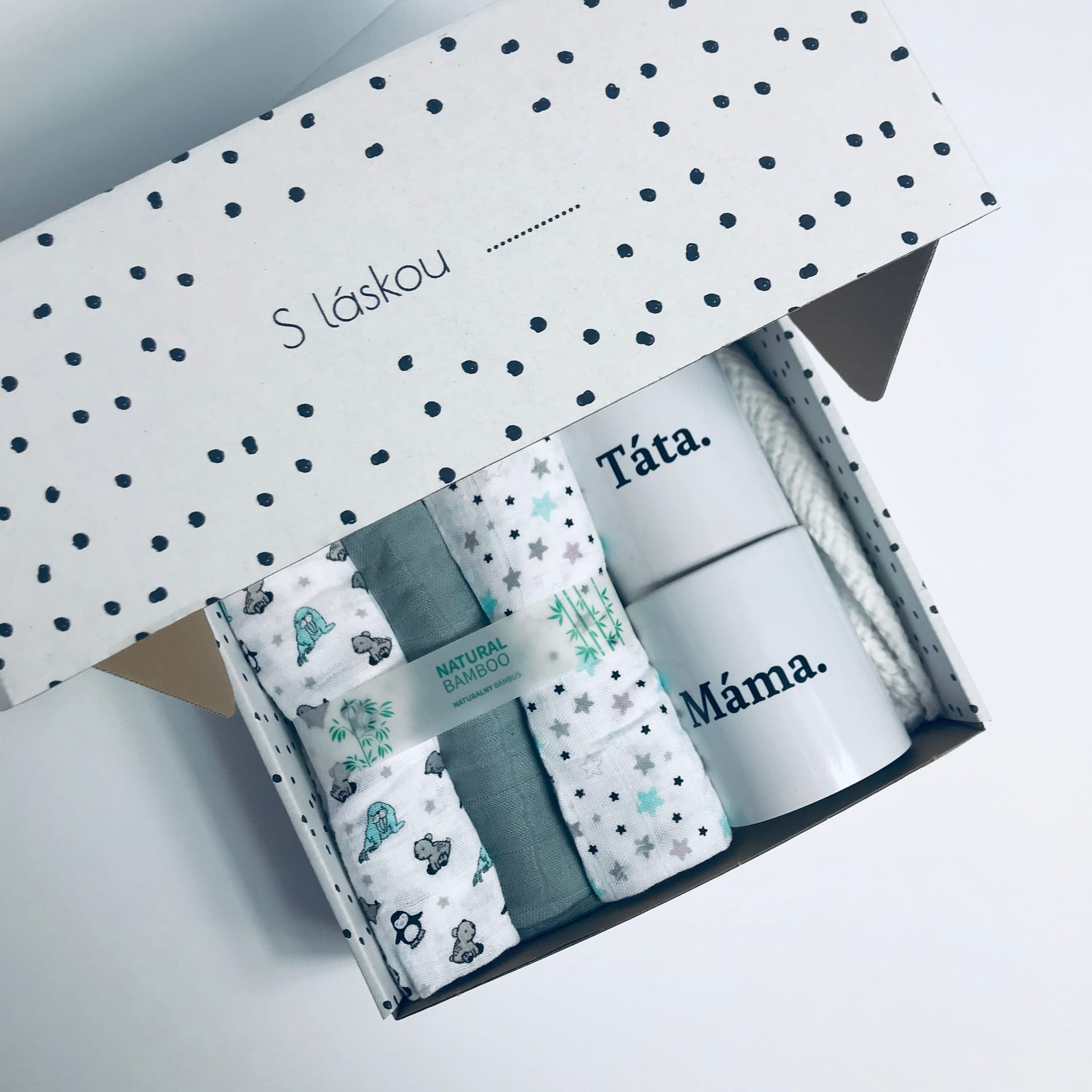 Dárková krabička s hrníčky, plenkami a dětským body