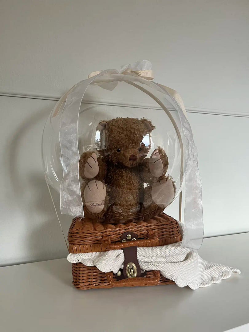 Uvnitř průhledného balónku je jemný plyšový medvídek. Celek je doplněný o pletenou deku, jmenovku a proutěný kufřík, který vše přirozeně spojuje.
