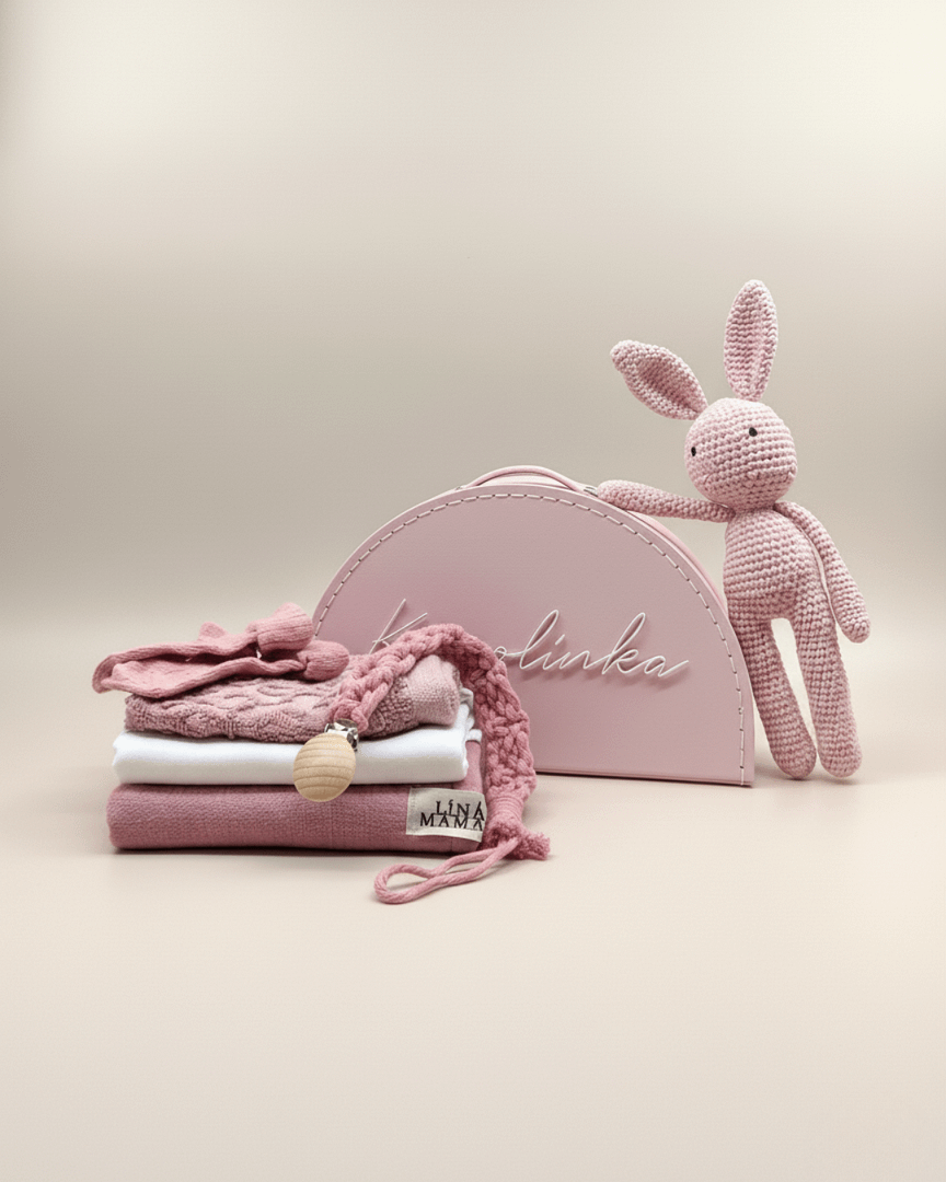 Kufřík k narození miminka v růžových tónech. Dárek pro miminko na první společné chvilky. Ideální jako dárek do porodnice či babyshower.