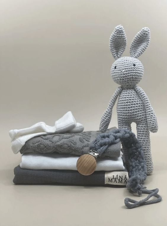 Obsahuje důležité maličkosti – bílé body a ponožky, bavlněný ručníček a mušelínovou plenku – vše s certifikací Oeko-Tex.