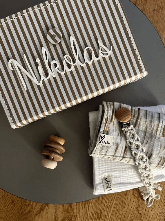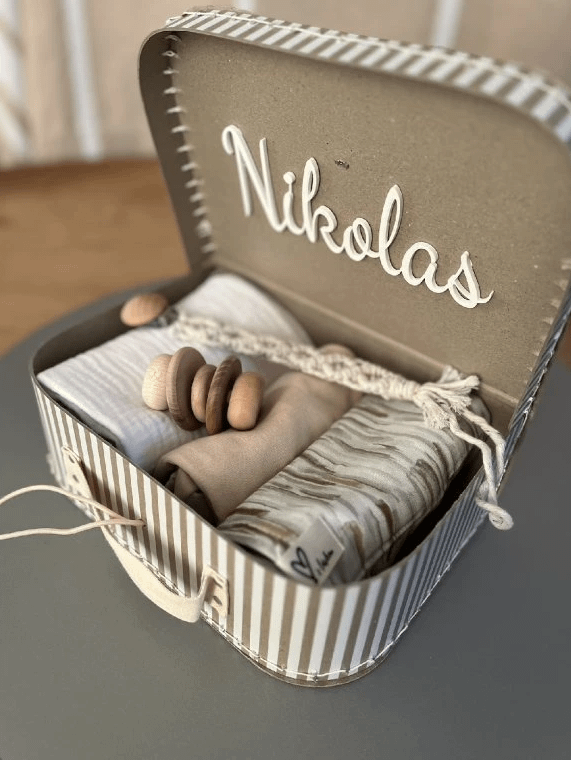 Kufřík k narození miminka v přírodních tónech. Dárek pro miminko, kde jemné materiály hrají hlavní roli. Jemný mušelín, bavlna a přírodní bukové dřevo. Přírodní – ekologické – šetrné. To je láska.